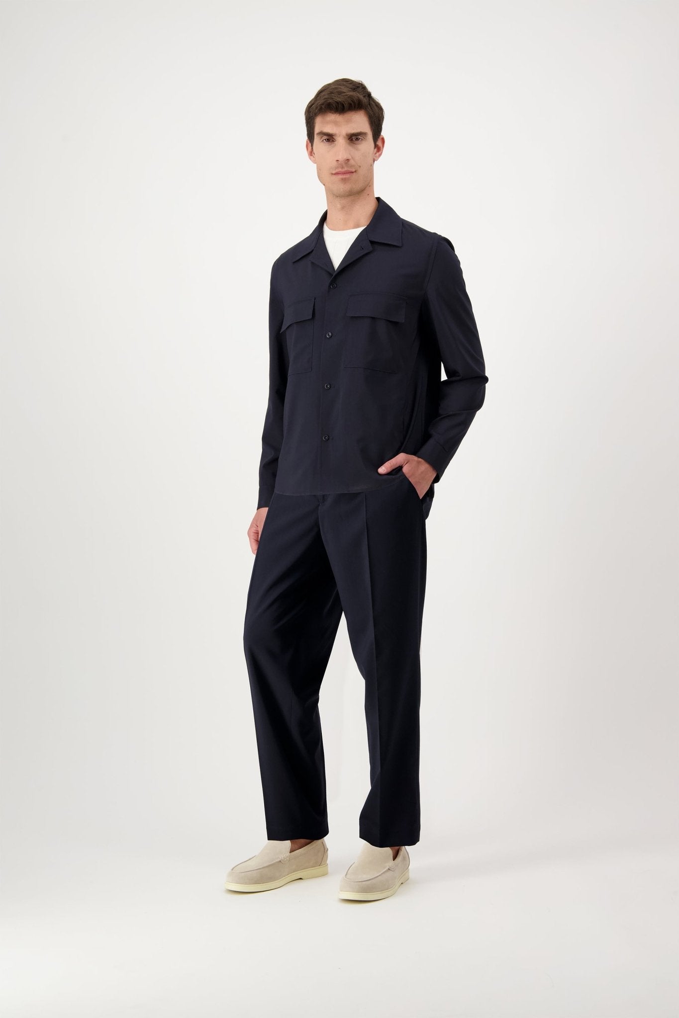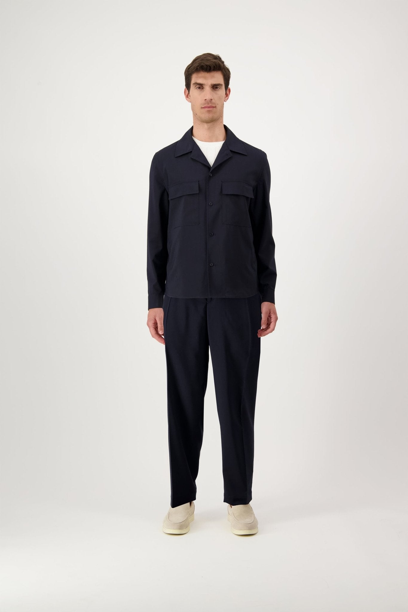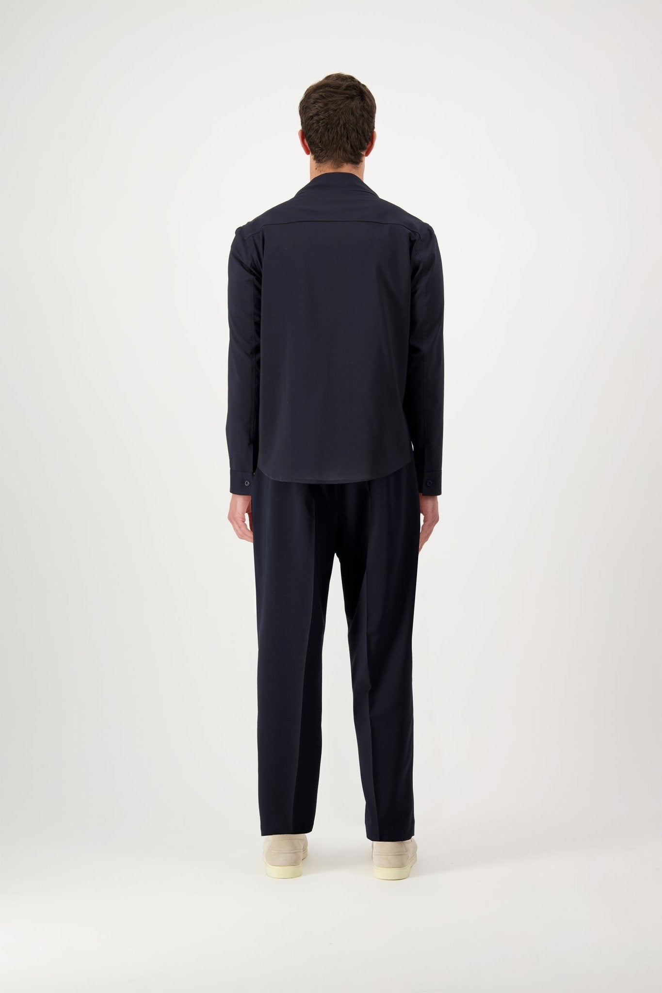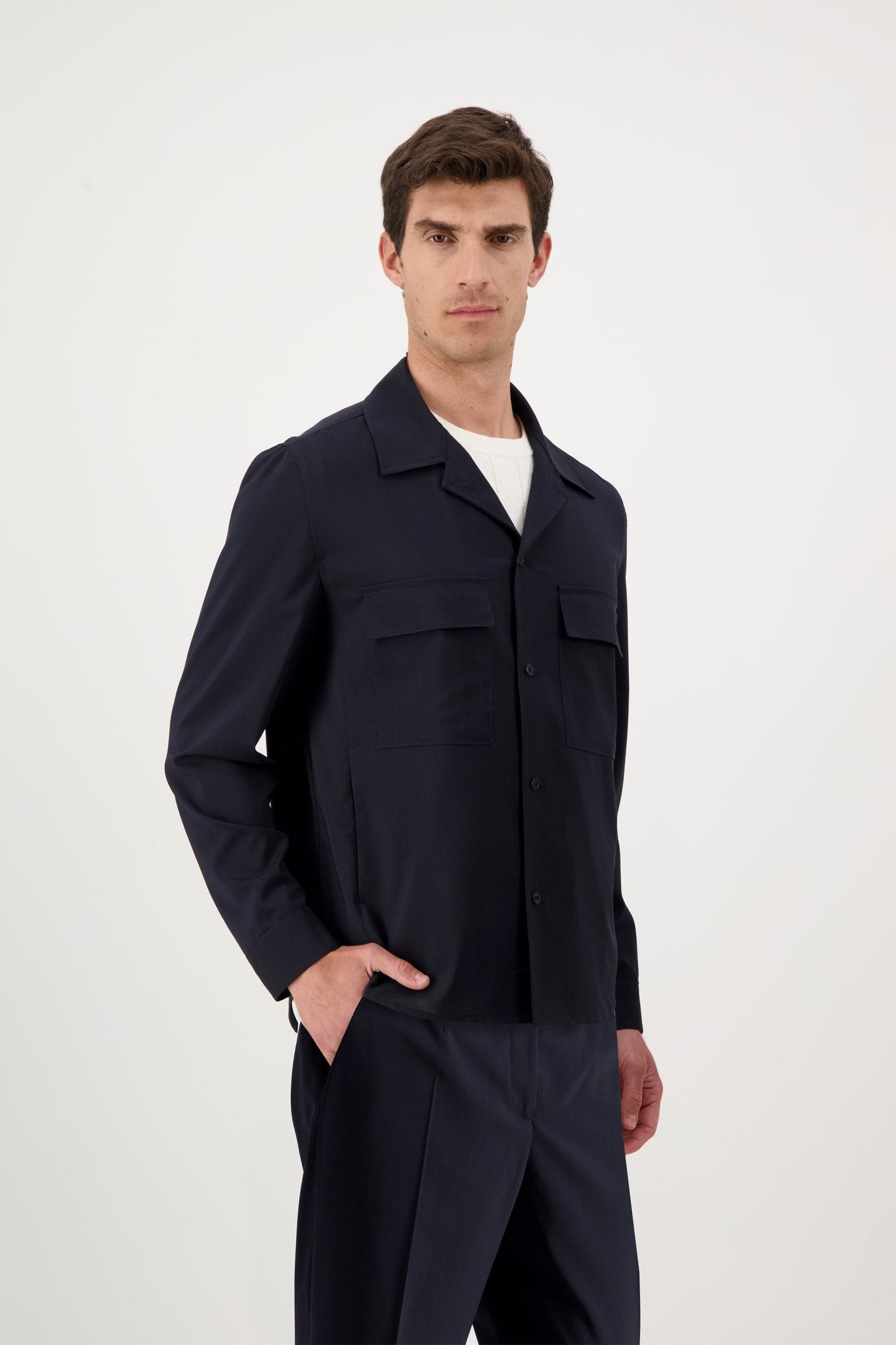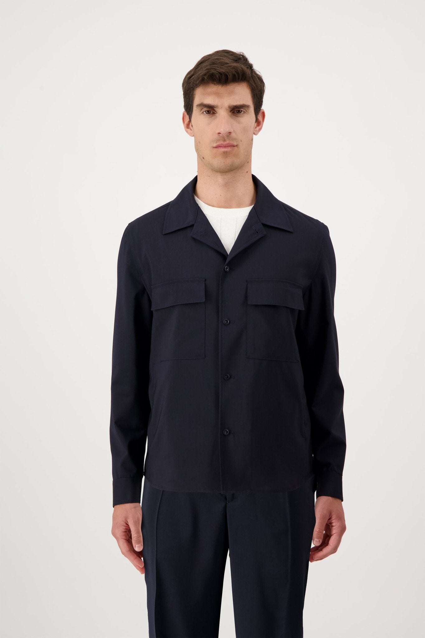 Overshirt con sei bottoni e due tasche applicate. Il modello è alto 188 cm e indossa la taglia 50.
