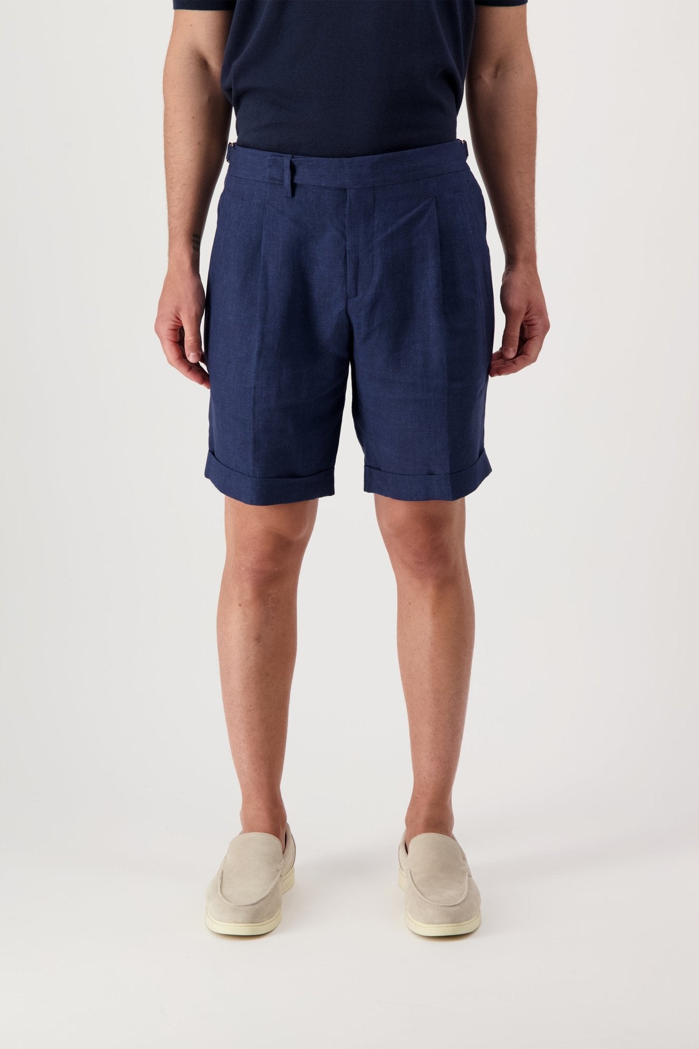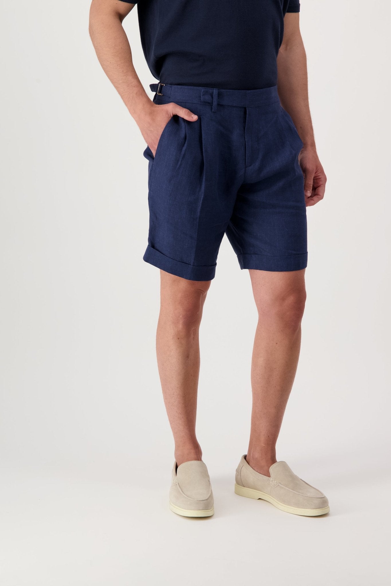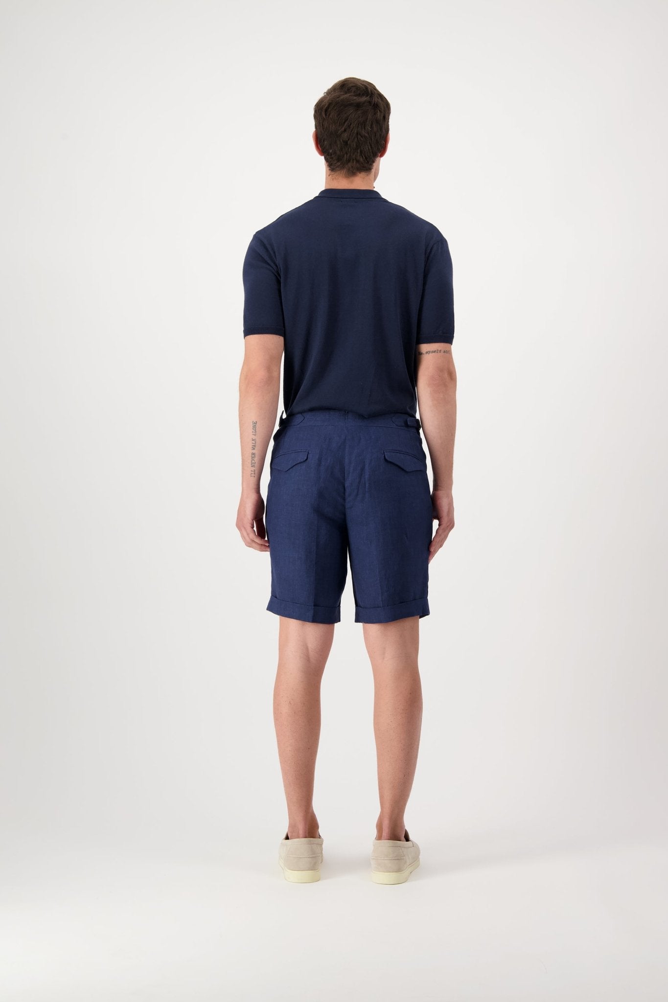 Pantaloncino in lino con tasche America e chiusura con zip. Il modello è alto 188 cm e indossa la taglia 50.