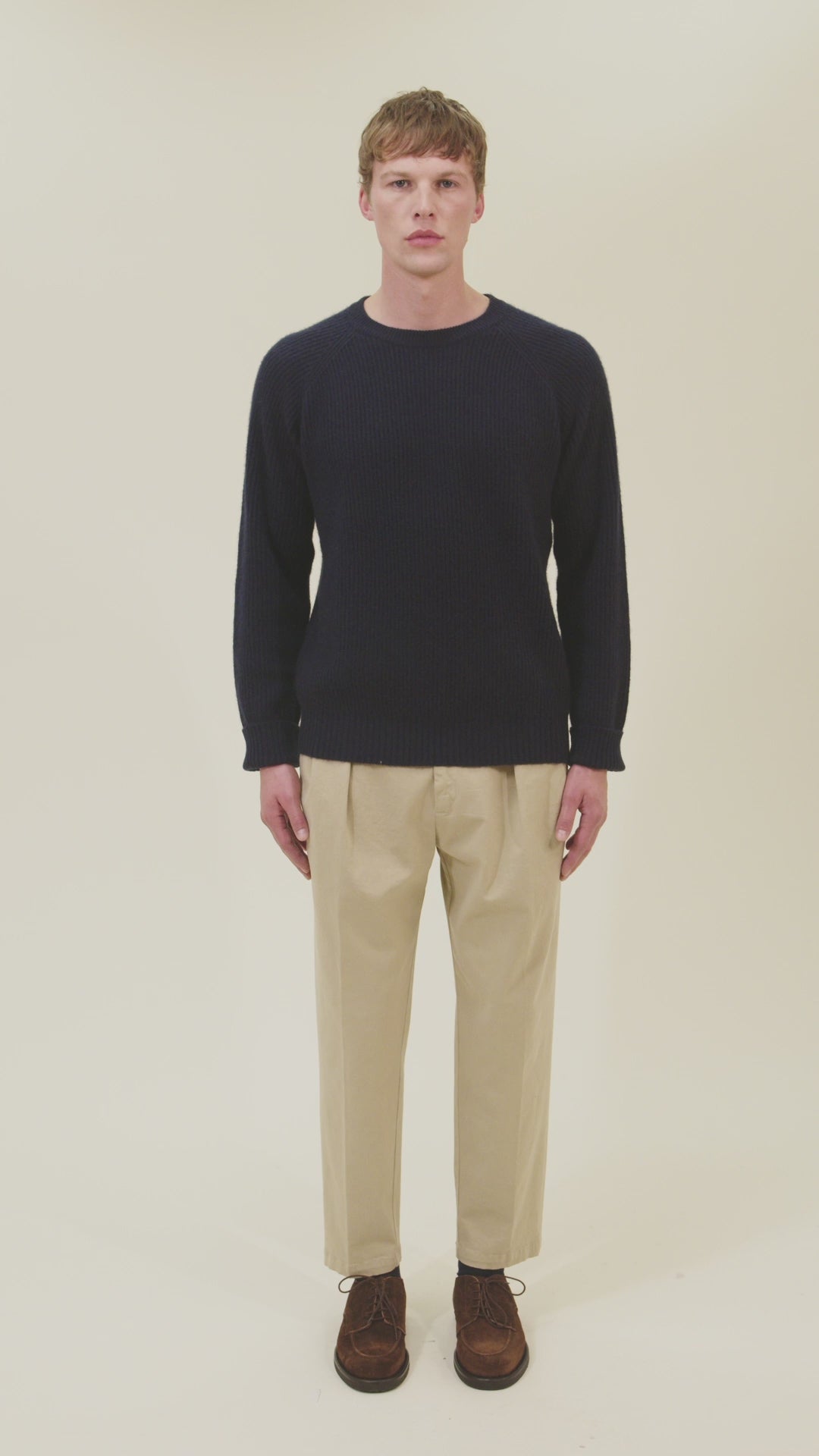 Maglia girocollo a costa inglese con manica raglan. Finezza 7 - 2 fili.