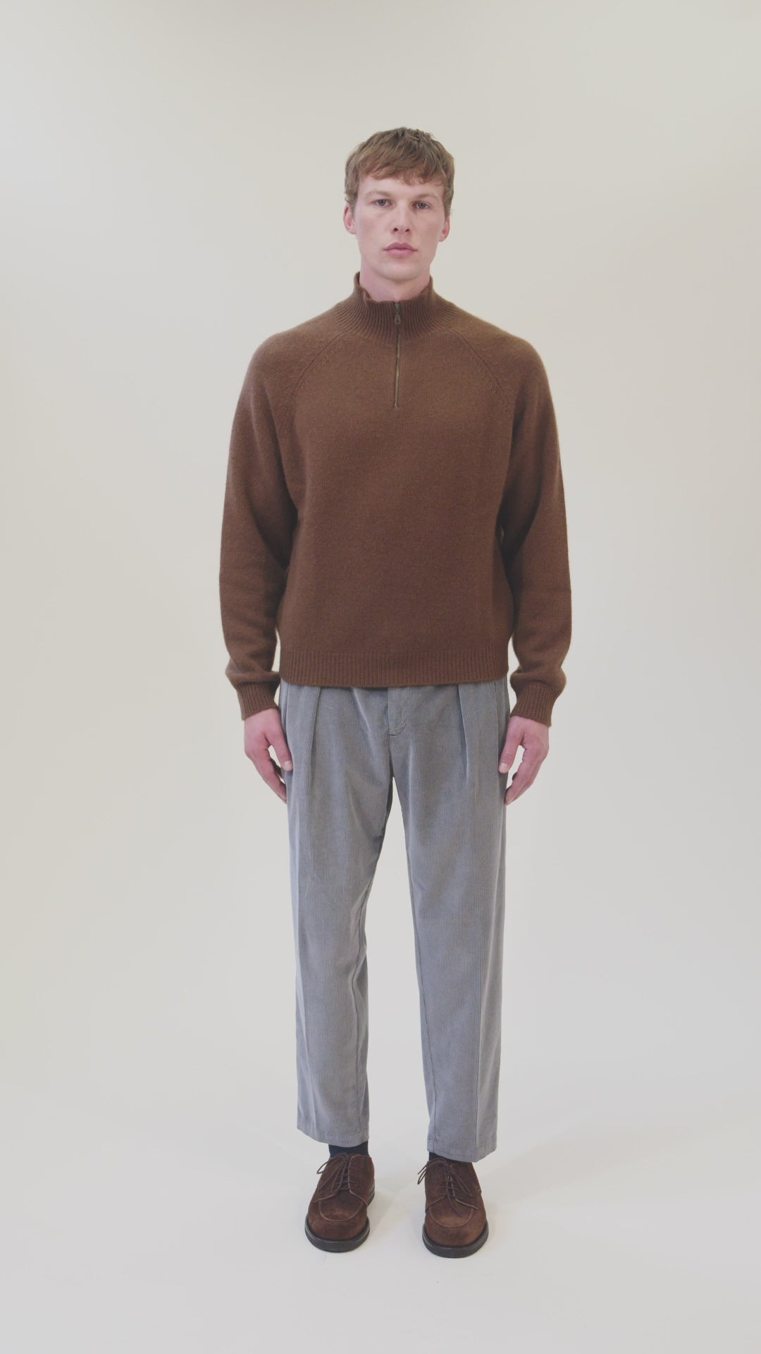 Pantaloni in velluto di cotone di squisita fattura, caratterizzati da eleganti pieghe frontali e da una comoda fascia elastica in vita. Il design sofisticato comprende una chiusura a zip e tasche americane per una funzionalità raffinata.