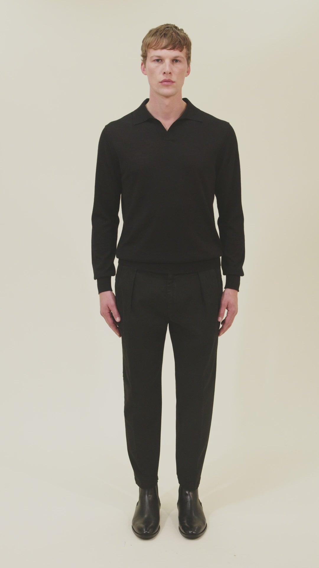 Pantalone in gabardina con pence frontale ed elastico sui fianchi per un maggior comfort. Chiusura a zip e tasche America. Il modello è alto 185 cm e indossa una taglia 46.