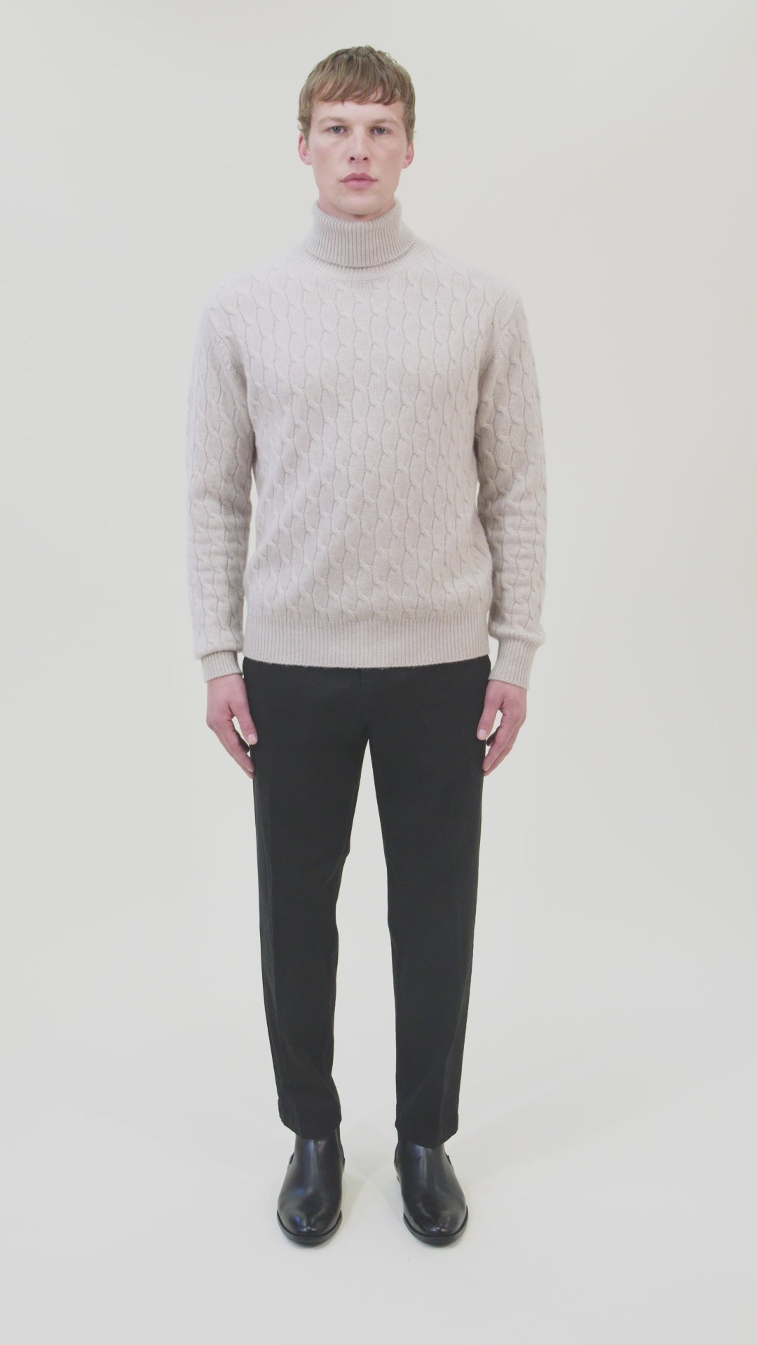 Maglia dolcevita con lavorazione a treccia. Finezza 7 - 2 fili. Il modello è alto 185 cm e indossa una taglia L.