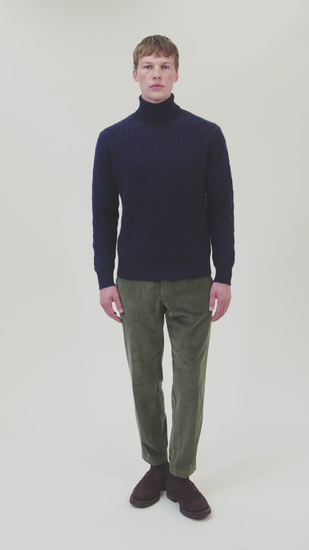 Maglia dolcevita con lavorazione a treccia. Finezza 7 - 2 fili. Il modello è alto 185 cm e indossa una taglia L.