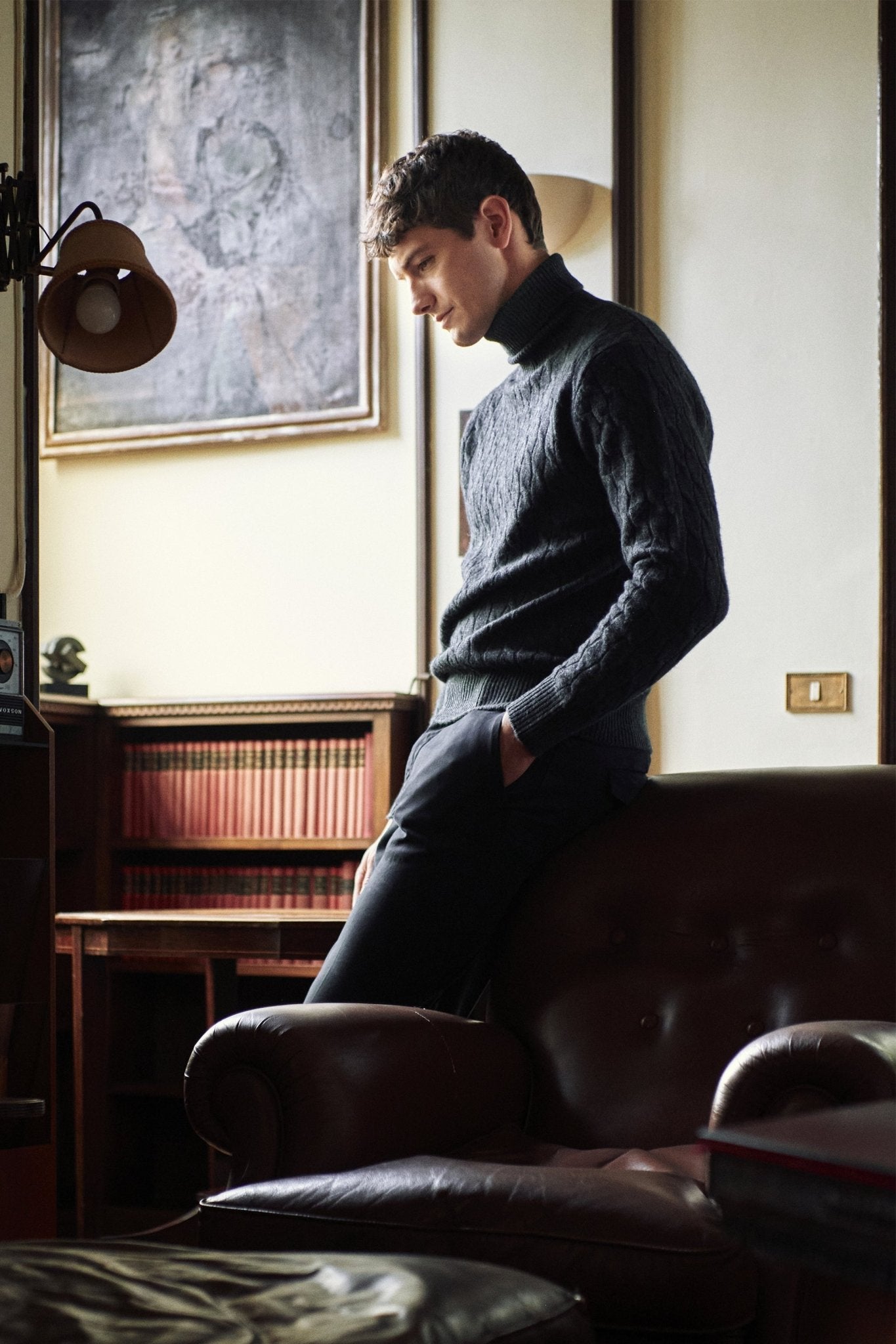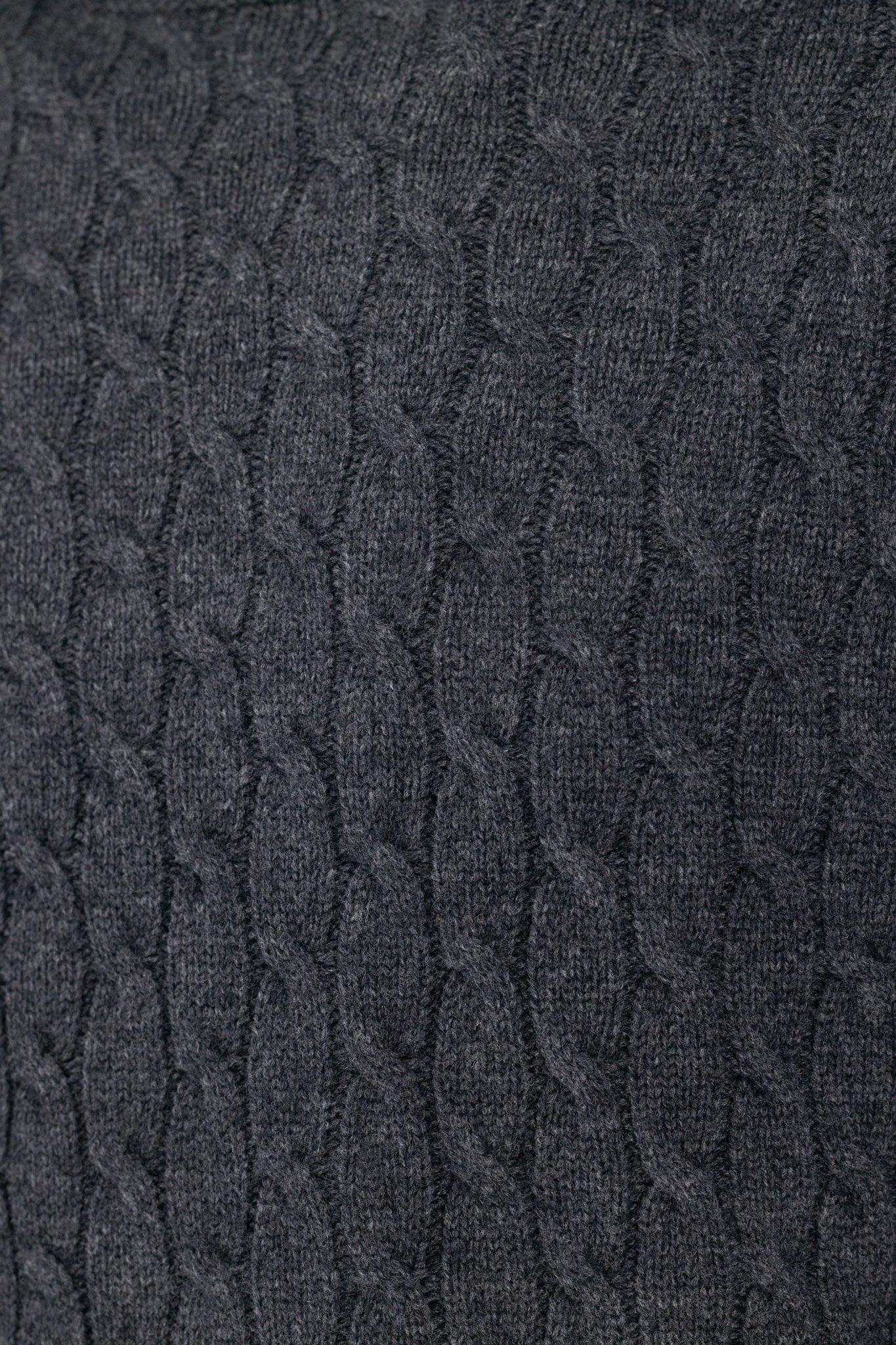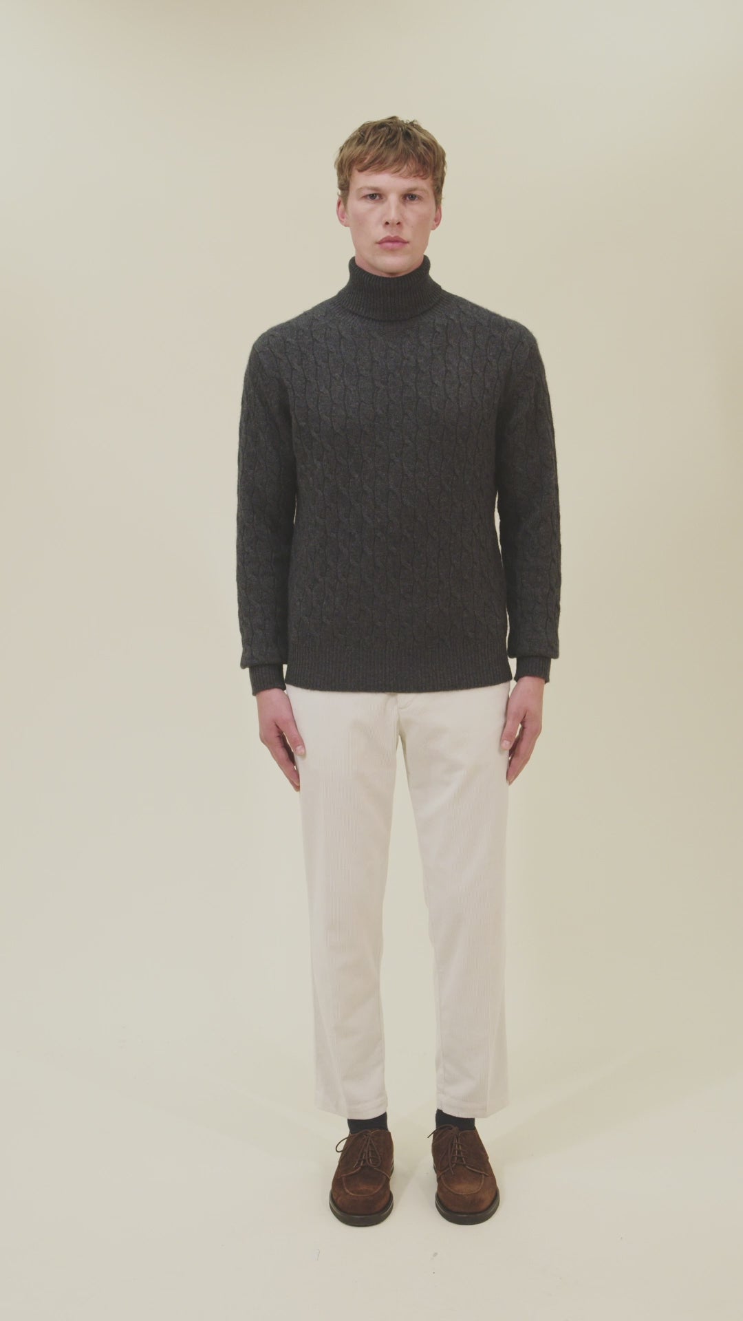Maglia dolcevita con lavorazione a treccia. Finezza 7 - 2 fili. Il modello è alto 185 cm e indossa una taglia L.