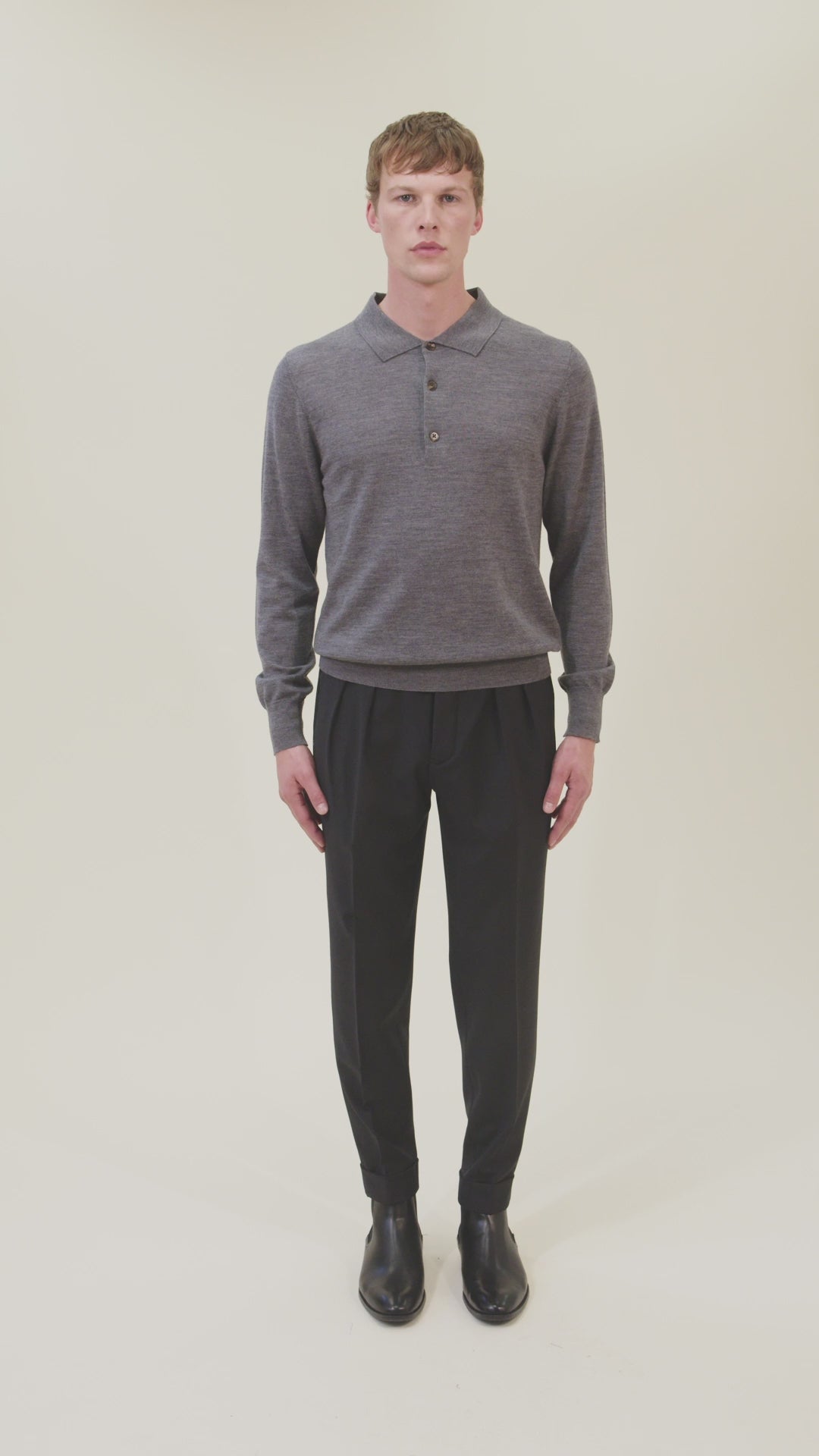 Elegante polo in maglia rasata di finezza 16, realizzata in pregiata lana merino con raffinata chiusura a tre bottoni. Il capo è presentato su un modello di 185 cm che veste una taglia L, con misure di 95 cm al petto, 82 cm in vita e 92 cm ai fianchi, offrendo un riferimento preciso per la vestibilità di questo sofisticato essenziale del guardaroba maschile.
