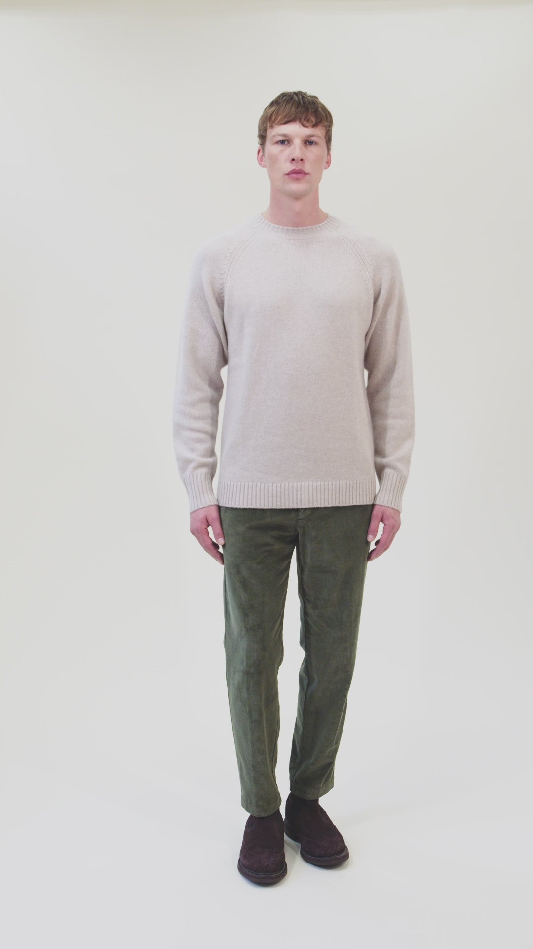Maglia girocollo rasata con spalla raglan. Finezza 5 - 3 fili.