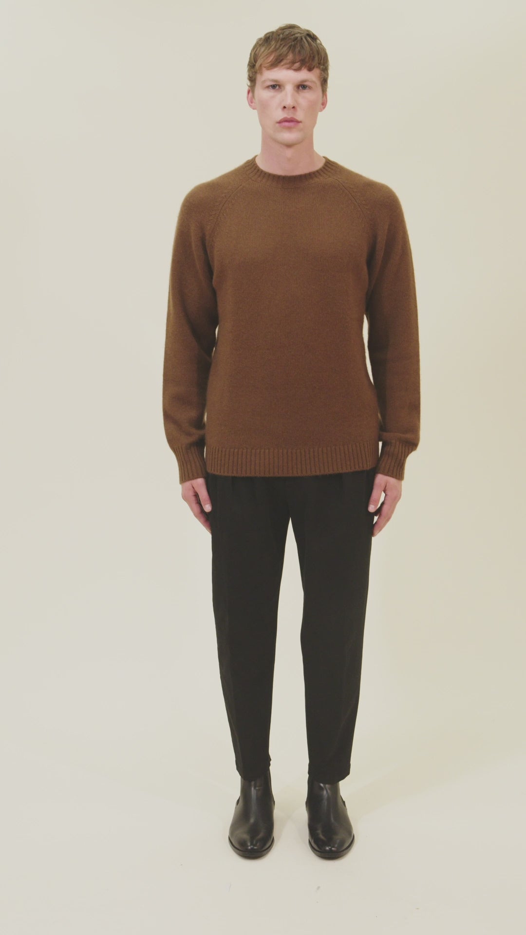 Maglia girocollo rasata con spalla raglan. Finezza 5 - 3 fili.