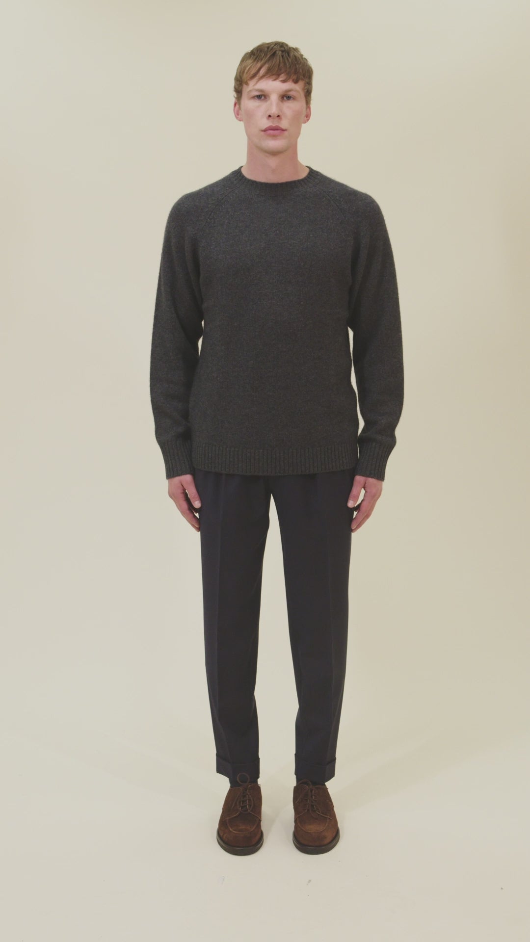 Maglia girocollo rasata con spalla raglan. Finezza 5 - 3 fili.
