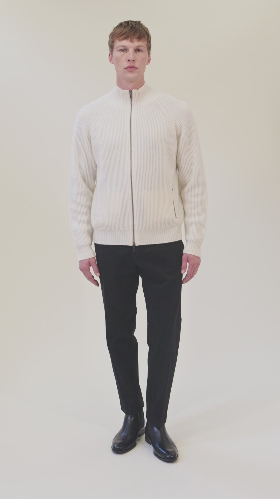 Sofisticato cardigan con zip integrale realizzato a costa inglese con maniche raglan e tasche laterali. Lavorato a maglia a calibro 7 con misto lana e cashmere a 2 strati.