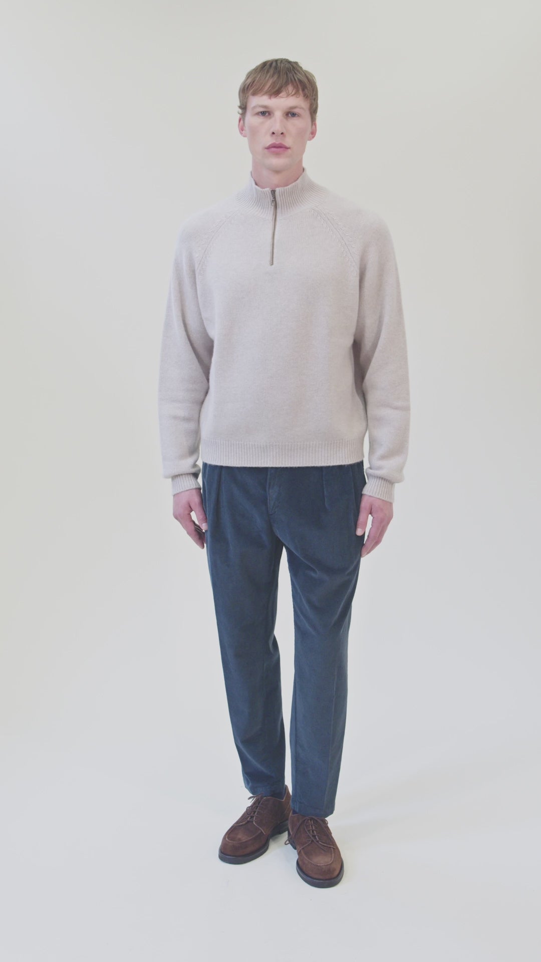 Maglione a collo alto con spalle raglan in misto lana e cashmere, elegantemente lavorato, con chiusura a zip centrale e maglia liscia a 3 strati da 5 gauge.