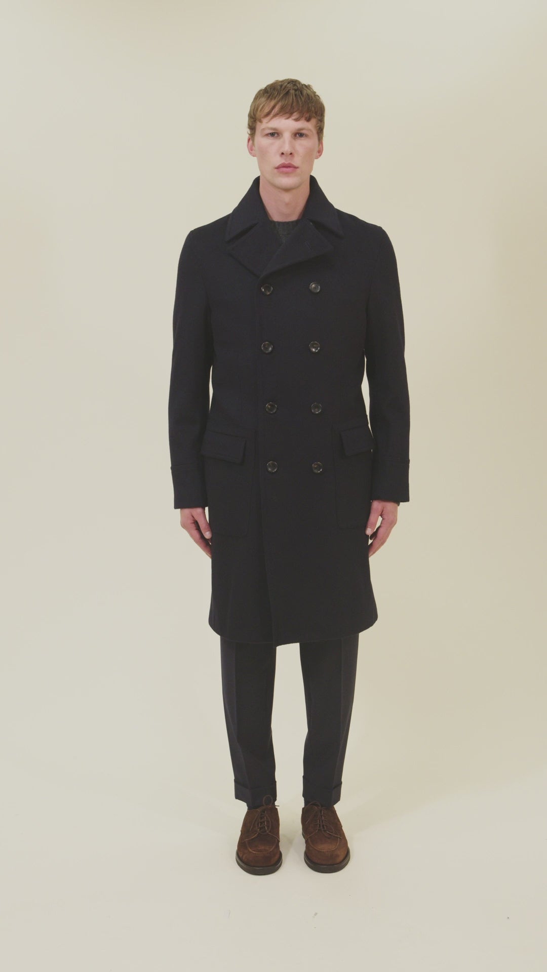 Il raffinato cappotto doppiopetto Nicholson presenta un elegante revers a dente realizzato in pregiata lana vergine del Lanificio Colombo. Si distingue per la cintura martingala sul retro e le sofisticate tasche con aletta applicata.