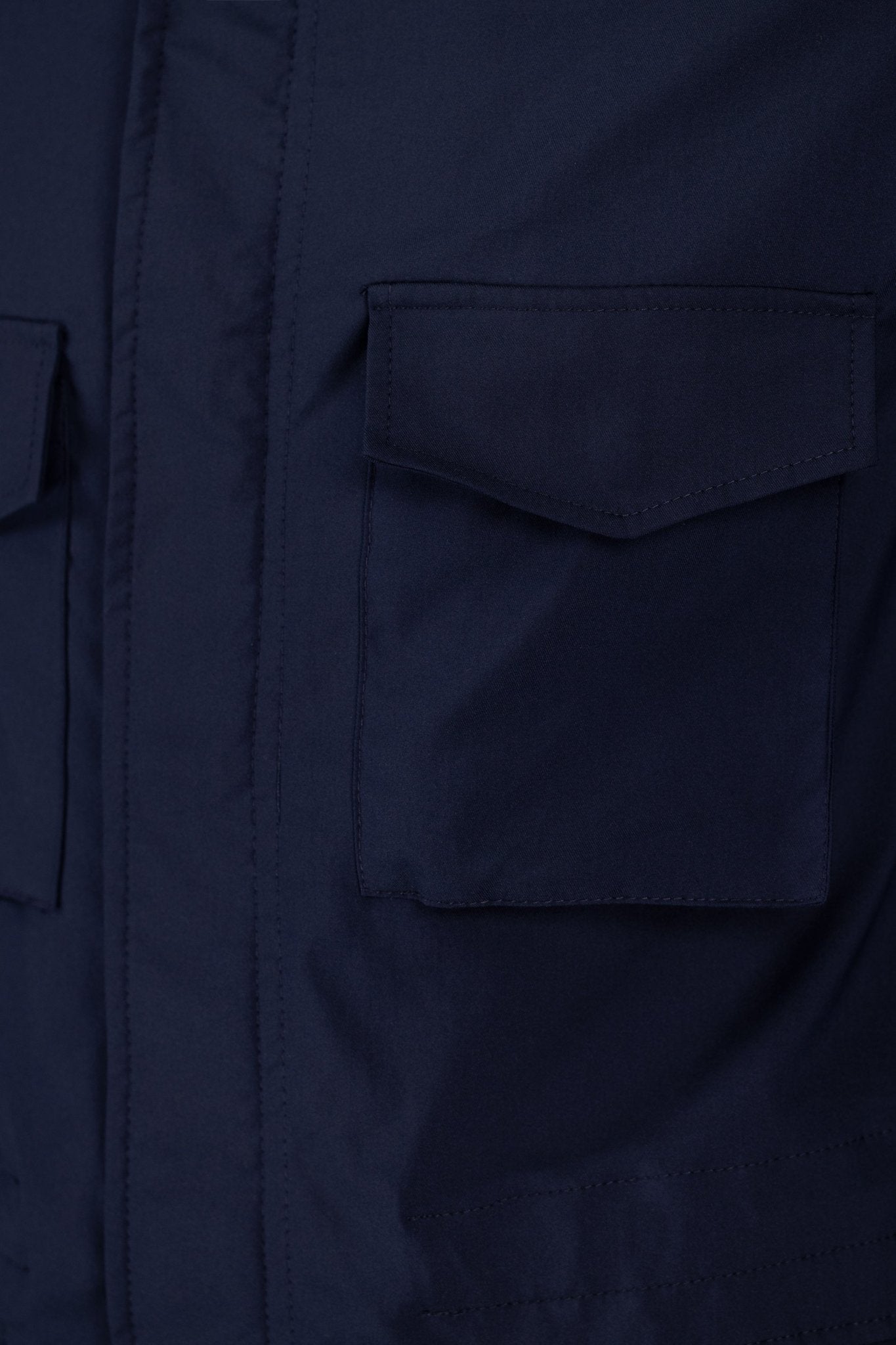 Cappuccio nascosto nel collo, quattro tasche frontali con pattina, chiusura frontale coperta con zip e bottoni a pressione, spalle con alamari, vestibilità regolare